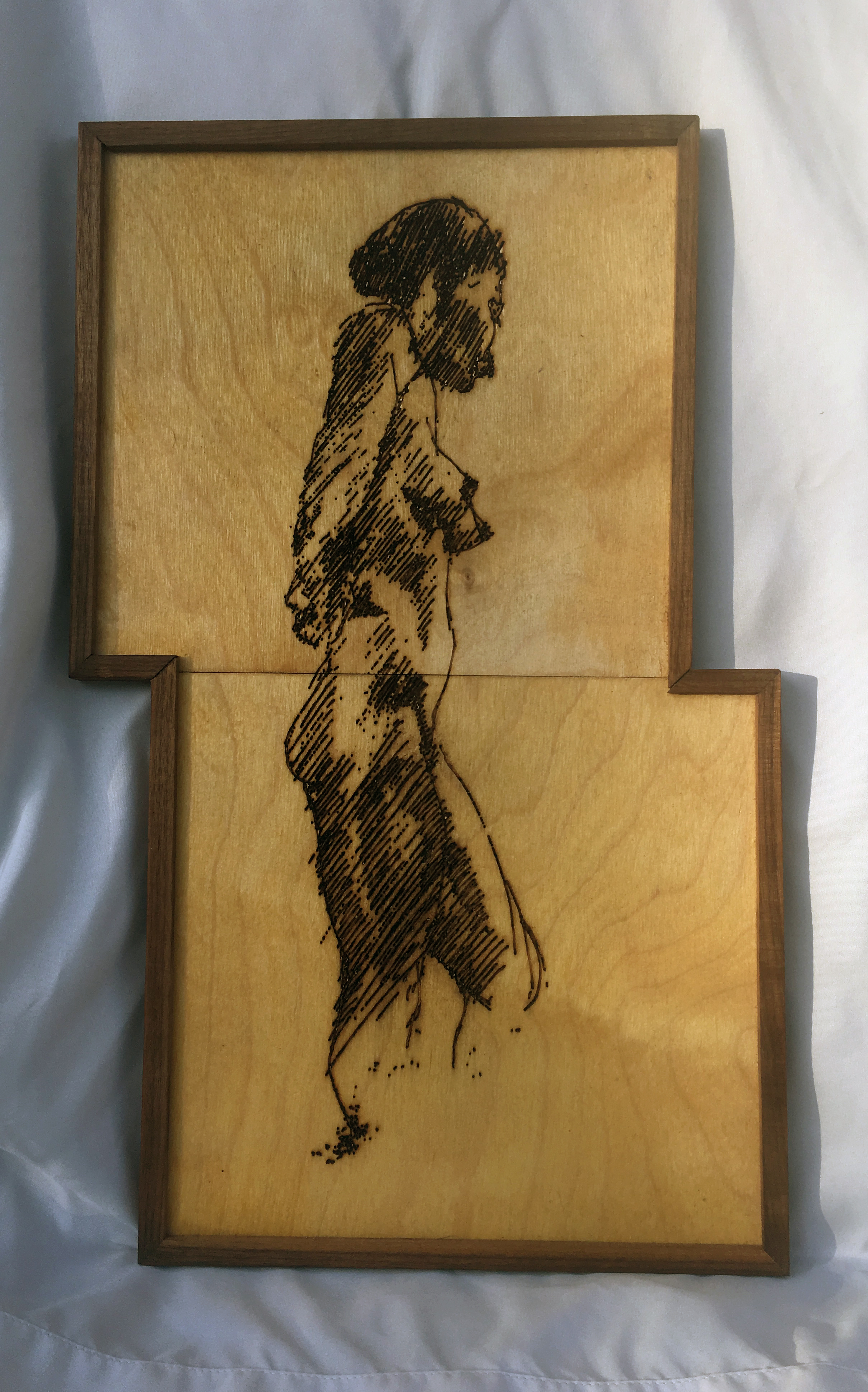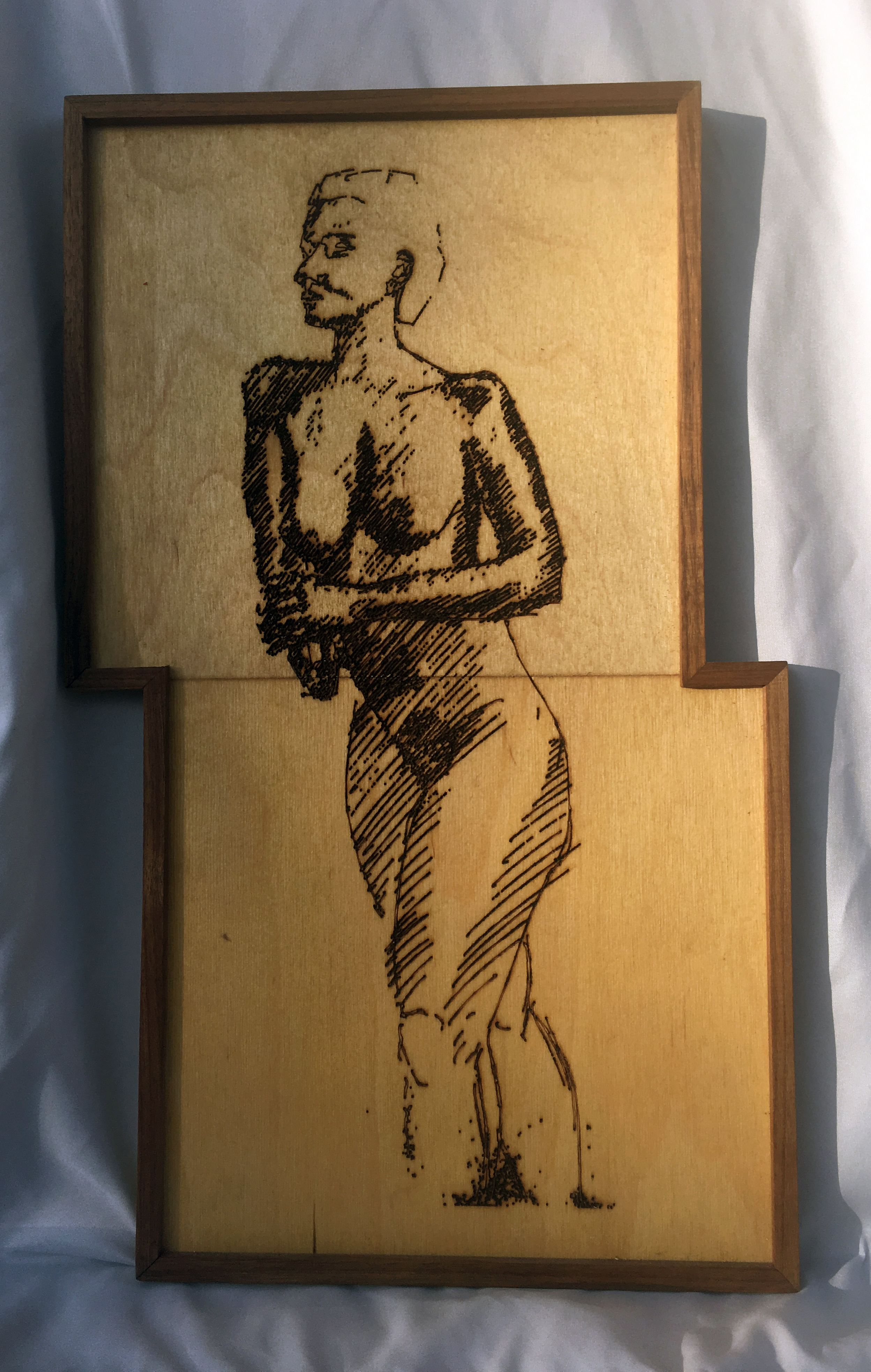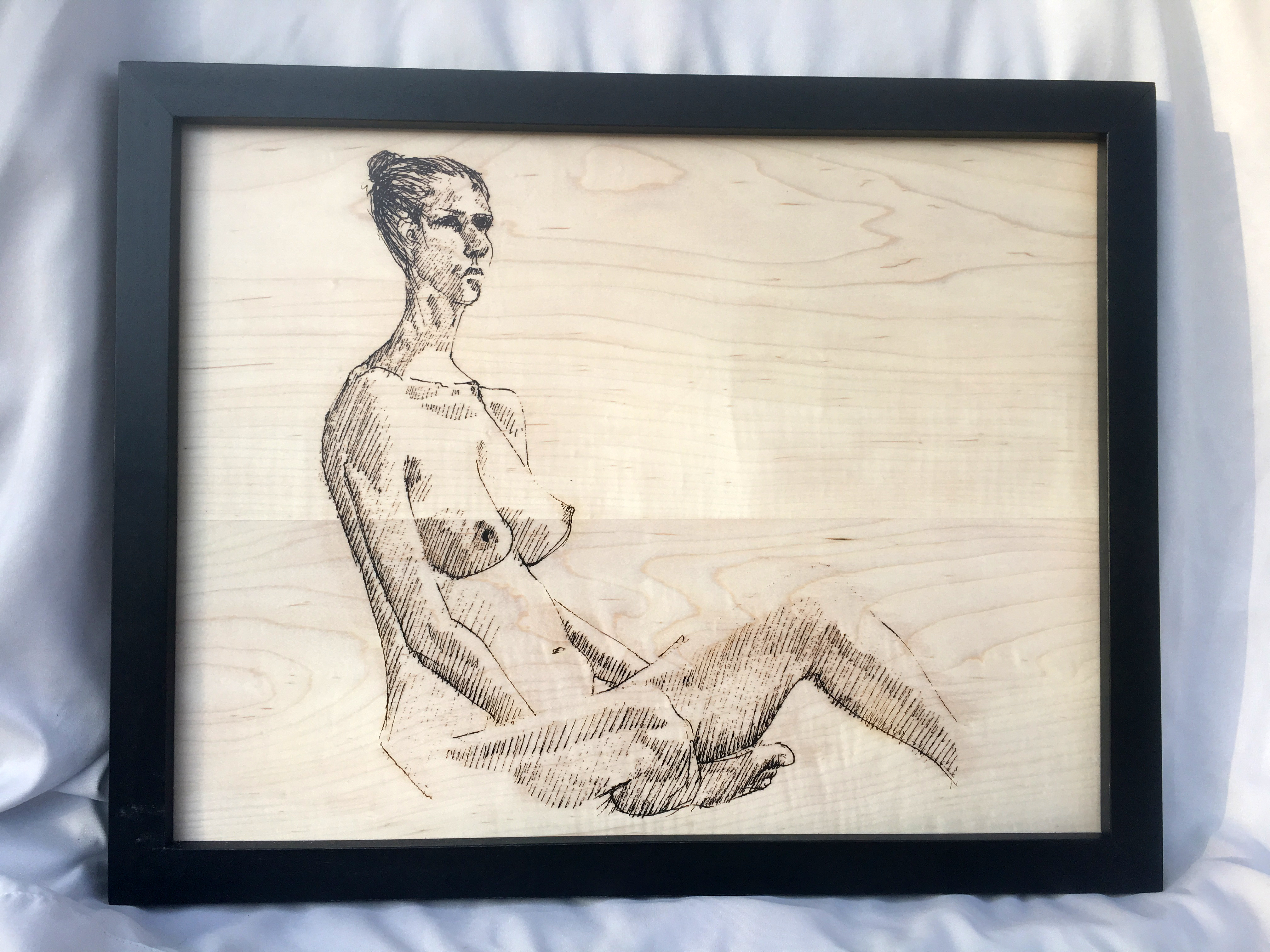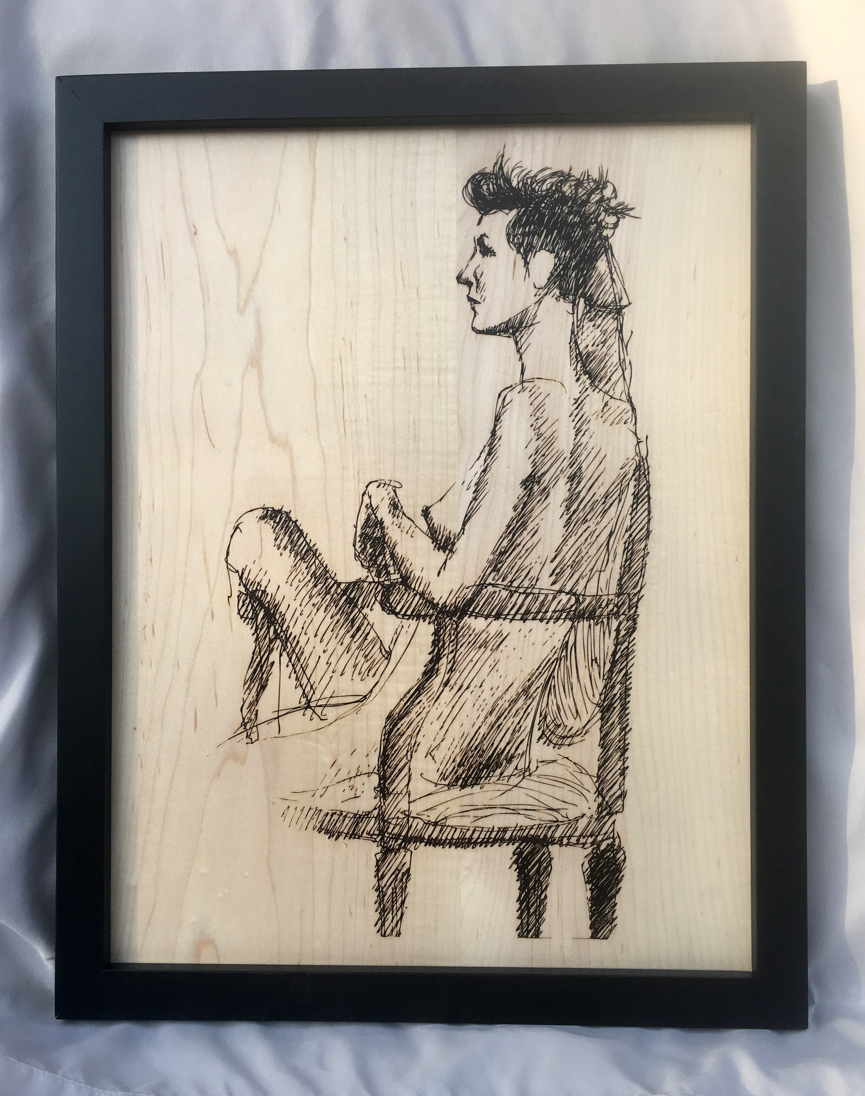 Laser etched drawing on pine